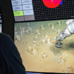 In December 2025, Brett Baker led a research cruise to collect microbial genomes off the coast of Uruguay. In this photo, Tyler Smith pilots a remotely operated vehicle collecting shallow