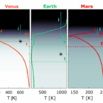 Height scales of atmospheres of Solar System’s terrestrial planets. The solid lines show the temperature profiles against altitude, while the background color reflects the atmospheric pressure. Horizontal dashed lines denote
