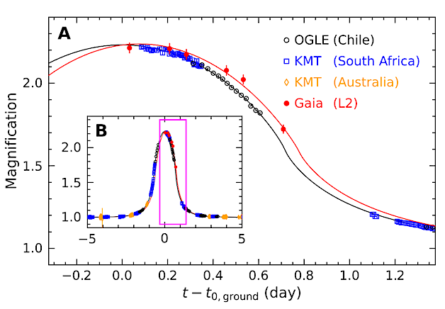 Light curves of the KMT-2024-BLG-0792/OGLE-2024-BLG-0516 microlensing event compared with the best-fitting model. (A)Circles (with 1 𝜎 error bars) indicate observations from the OGLE telescope in Chile (black open circle), a KMTNet telescope in South Africa (blue square), a KMTNet telescope in Australia (orange diamond), and the Gaia spacecraft at L2 (red solid circle). Their source magnification is plotted as a function of time (t), relative to the time of peak magnification determined from the ground-based data (𝑡0,ground = 2460434.323 barycentric Julian date) (table S1). The solid lines indicate the best-fitting microlensing models of the groundbased data (black) and Gaia data (red); the latter reaches its peak approximately 1.9 hours later than the former. (B) Same as (A), but showing an expanded view spanning 10 days. The magenta box indicates the region shown in A. — astro-ph.EP
