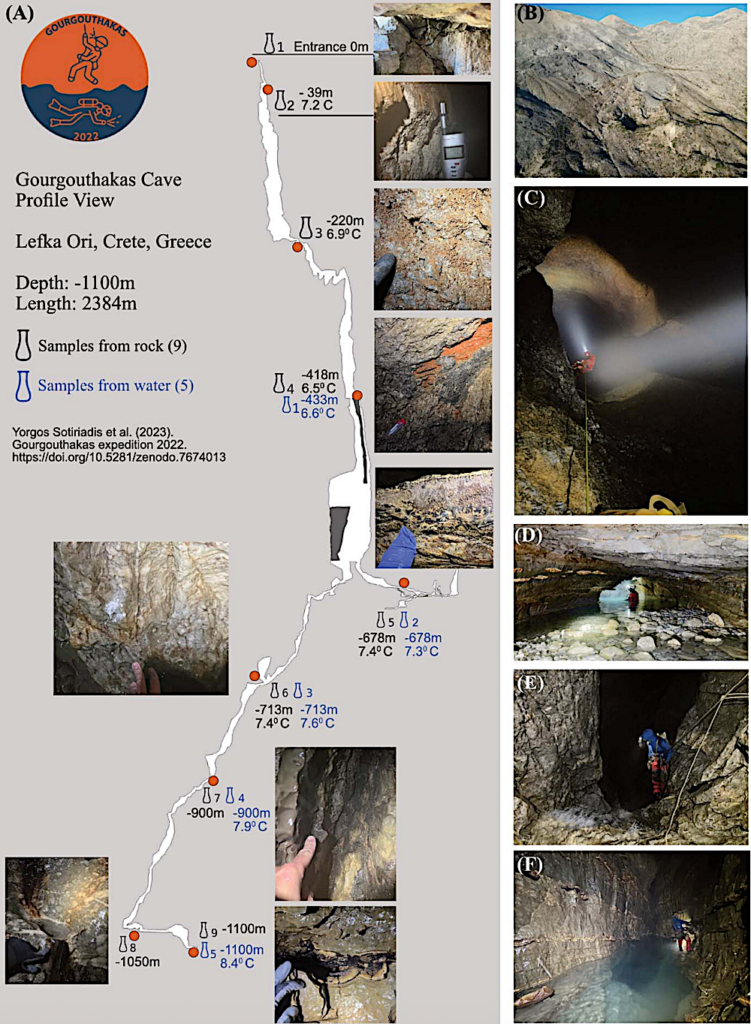 Gourgouthakas cave microbiome sampling and topography. (A) Samping sites along the cave with the respective picture of the substrate material (Photos S. Paragkamian). (B) The area Atzinolakas with the complex karst and faults (Photo M. Vaxevanopoulos). (C) One of the main pits of the cave, named Guillaume, at -450 m (Photo Y. Sotiriadis). (D) First siphon of the karstic aquifer at -678m (Photo Y. Sotiriadis). (E) Pit “Samuel” at -950m with constant flow of water (Photo M. Vaxevanopoulos). (F) Last siphon at -1100 m depth (Photo M. Vaxevanopoulos) — biorxiv.org