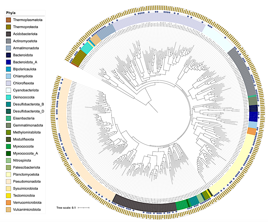 MAGs that are at least 70% complete and with less than 5% contamination. Phyla are colored