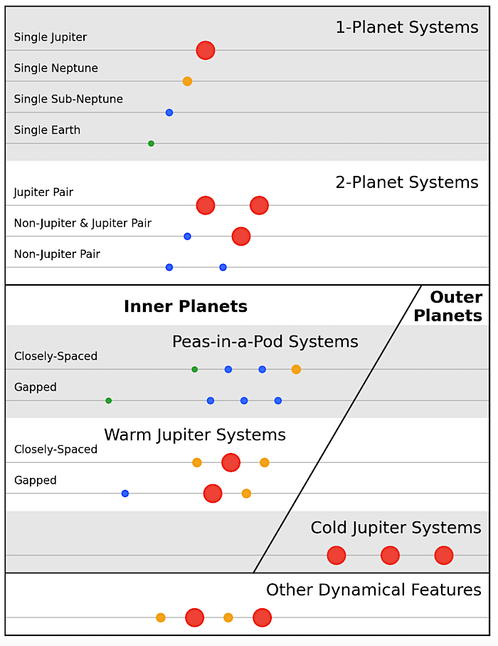 Abridged quick-reference chart for our classification of planetary system architectures presented in Paper I. Each row corresponds to one planetary system, with horizontal spacing corresponding to orbital period on a log scale and point sizes corresponding to planet size. Colors correspond to planet type: jupiters in red, neptunes in yellow, sub-neptunes in blue, and earths in green. — astro-ph.EP