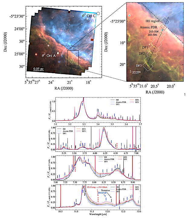 Top: Left: false color NIRCam image of the Orion Bar11 showing the NIRSpec mosaic footprint (white boundary). The composite image combines AIB emission (red), H2 emission (green), and H I Paschen α (blue). Top Right: Blow up of the area mapped spectrally with NIRSpec and MIRI. The black boxes define the apertures where the spectra shown in the bottom panel were extracted.12 DF1−3 indicate the positions of the H2 dissociation fronts. The location of two proplyds in the Orion Bar are marked by small circles. Figure taken from.13 Reproduced with permission from Astronomy & Astrophysics, Ⓒ ESO. — astro-ph.GA
