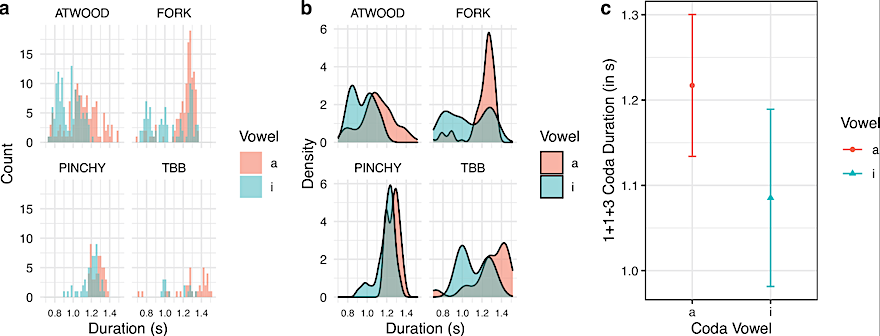 A histogram (a) and a density plot (b) of raw coda durations (in seconds) of the 1+1+3 coda for four whales. Estimates of the mixed-effects linear regression model are from electronic supplementary material, table S2, with 95% CIs (c). — Royal Society Proceedings B