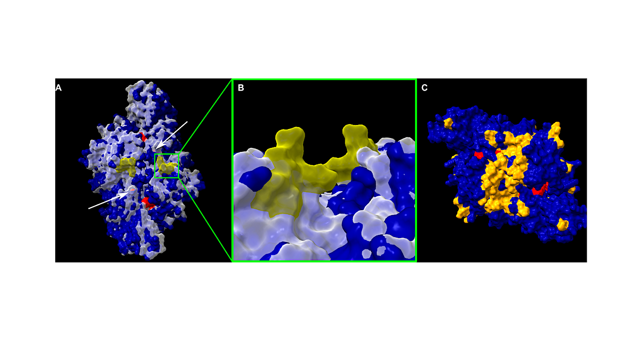 Rubisco form II structural differences between T. arctica UC1 and H. marinus. (A) AlphaFold-generated structures for H. marinus (transparent white) and T. arctica UC1 (dark blue) Rubisco form II dimers. Active sites are colored red. Arrows point to the additional exposed active site residues in UC1 compared to H. marinus. The missing residues in UC1 at amino acid positions 78–82 (Fig. 4) are colored yellow on H. marinus structure (a close-up view in B). (C) UC1 form II dimer with residue differences to H. marinus that confer a semi-conservative or non-conservative change highlighted in orange. — Applied and Environmental Microbiology via PubMed