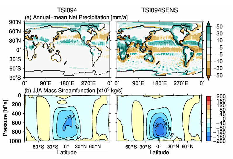 (a) Net precipitation, defined by precipitation minus evaporation (includes ice sublimation), (b) boreal summer meridional atmospheric mass streamfunction (109 kg/s, positive indicates clockwise circulation) in the TSI094 and TSI094SENS experiments. — physics.geo-ph