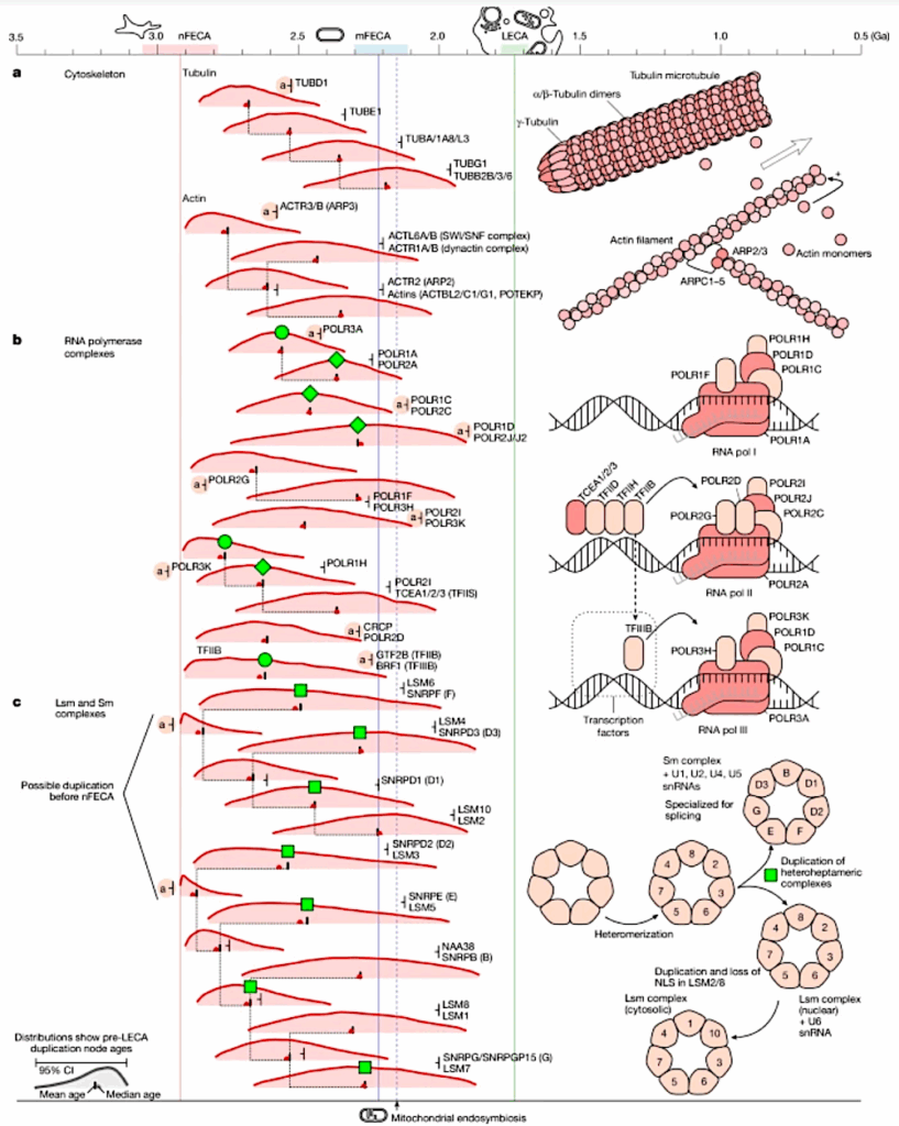 a, Eukaryotes inherited two families of cytoskeletal filament-forming proteins from Asgard archaea, which underwent multiple rounds of duplication before LECA and provide information about the evolution of cytoskeletal complexity. The nuclear compartment is defined by apparently eukaryote-specific gene families, although constraints on nuclear formation can be inferred from duplications in genes whose maturation pathways and function involve transport between compartments. b,c, Pre-LECA duplications in the RNA polymerase (b) and Sm–LSm (c) complexes. Symbols next to each gene family indicate lineage of descent (a, Asgard). Green shapes connect duplication events expected to have a similar age — Nature.