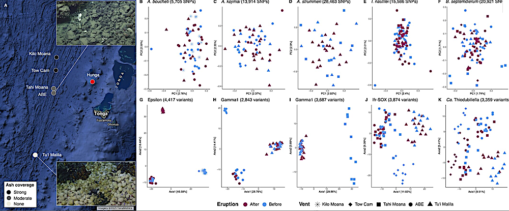 Geographic map of vent field locations (A) and principal component plots for the Alviniconcha, Ifremeria and Bathymodiolus host species (B–F) and their corresponding symbionts (G–K) based on genomic variant data. Photo insets in panel (A) show healthy mollusc communities at Tu’i Malila (bottom) and ash-covered mollusc communities at ABE (top). Blue colours in the PCA plots indicate samples collected pre-eruption, while red colours denote samples collected post-eruption. Map data 2025 Google. — Molecular Ecology