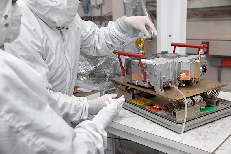 The SwRI-led UVS instrument collects ultraviolet light to assess the composition of Europa’s atmospheric gases and surface materials. It detected oxygen, hydrogen and dust features in the interstellar comet 3I/ATLAS and made unique downstream observations of its tails. Europa-UVS Co-deputy principal investigator Dr. Tracy Becker (left) and Europa-UVS principal investigator Dr. Kurt Retherford (right) are pictured with Europa-UVS during clean cabin testing. — Southwest Research Institute