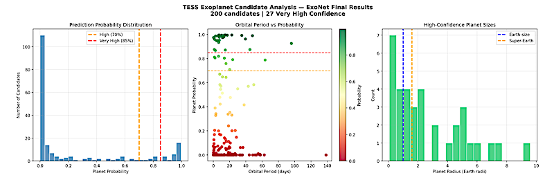 ExoNet predictions on 200 TESS Planet Candidates. Left: Probability distribution; dashed lines at 70% and 85%. Center: Orbital period vs. planet probability, colored by confidence tier. Right: Radius distribution of high-confidence candidates (≥ 70%). Md.Rashadul Islam