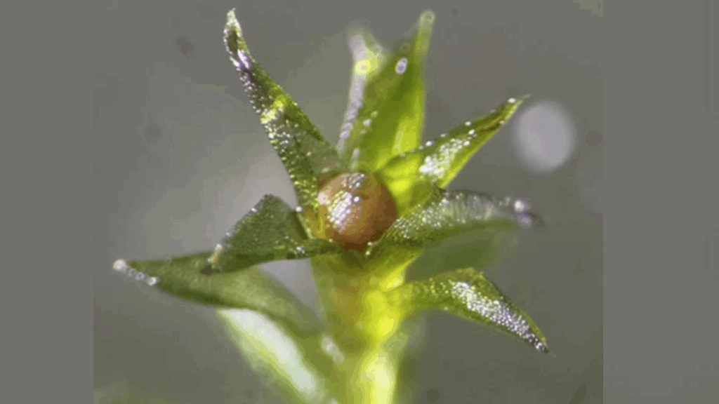 A reddish-brown sporophyte can be seen at the top center of a leafy gametophore. This capsule contains numerous spores inside. Mature sporophytes like these were individually collected and used as samples for the space exposure experiment conducted on the exposure facility of the International Space Station (ISS). CREDIT Tomomichi Fujita