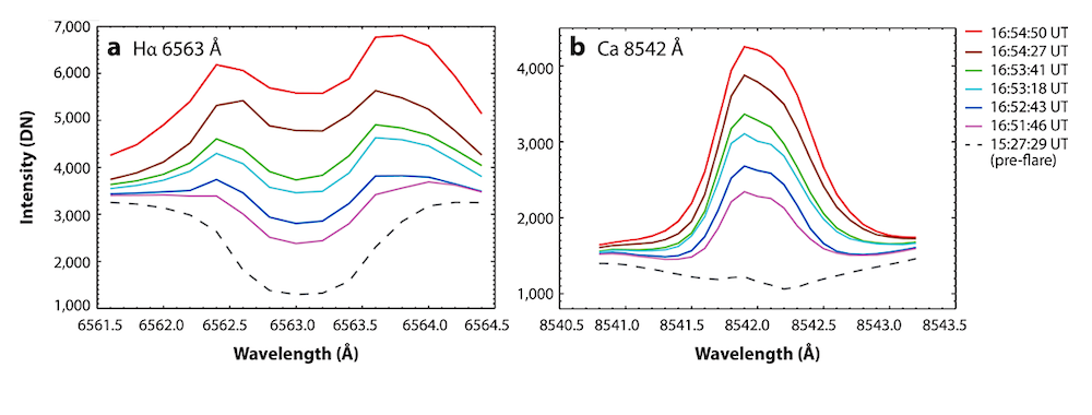 Temporal evolution of Hα and Ca 8542 in a solar flare spectrum (Kuridze et al., 2015). The