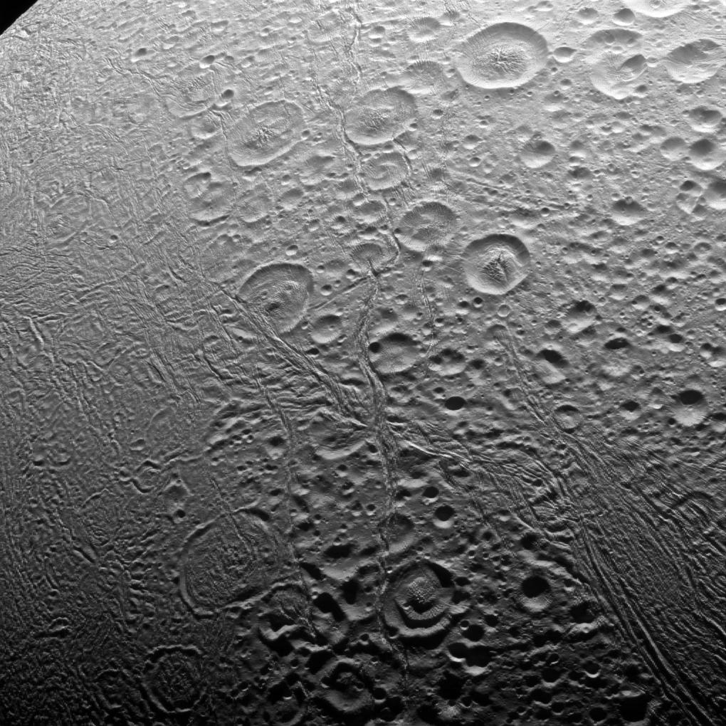 View larger. | A visible-light image of Enceladus’ north pole, taken by Cassini on November 27, 2016. The terrain is much more cratered than in the south, but the infrared images – and the cracks in the surface seen here – show there has been at least some geological activity in the region. Image via NASA/ JPL-Caltech.