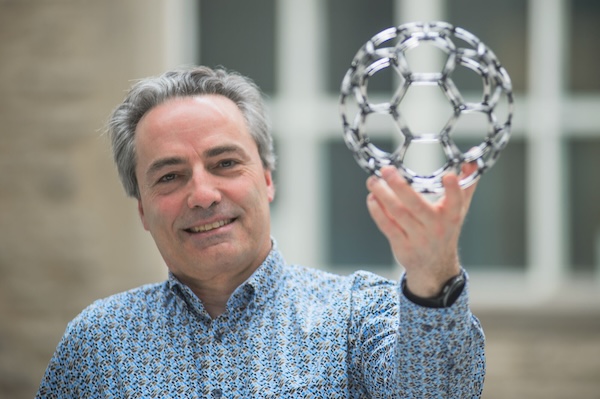 Jan Cami of Western University demonstrates a buckyball model. Credit: Christopher Kindratsky/Western Communications
