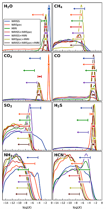 Marginal posterior distributions of the chemical abundances for all included molecules, retrieved using different JWST instrument combinations. The shown distributions were derived from the samples via kernel density estimation (KDE; Gaussian kernel with bandwidth h = 0.1). For each distribution, markers indicate either the 1σ credible interval, in cases of well-constrained posteriors, or the 95th percentile upper limit (arrows) when only an upper bound can be established. — astro-ph.EP