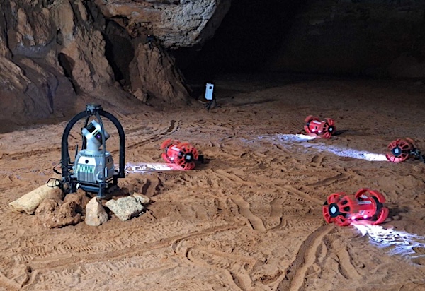 The field test campaign included two experiments. The first was testing of swarm robots in an actual natural cave. Approximately ten small robots exported from Japan were deployed to explore diverse environments within the cave. These robots performed autonomously, while acting collectively as a cohesive group. They explored a wide area, getting into narrow spaces barely passable by a person crawling on hands and knees, reaching deep inside, and returning. Such exploration was impossible with conventional large robots. The positions of the robots as well as the terrain structure were measured in real time by CSIRO, using their Wildcat SLAM technology *.