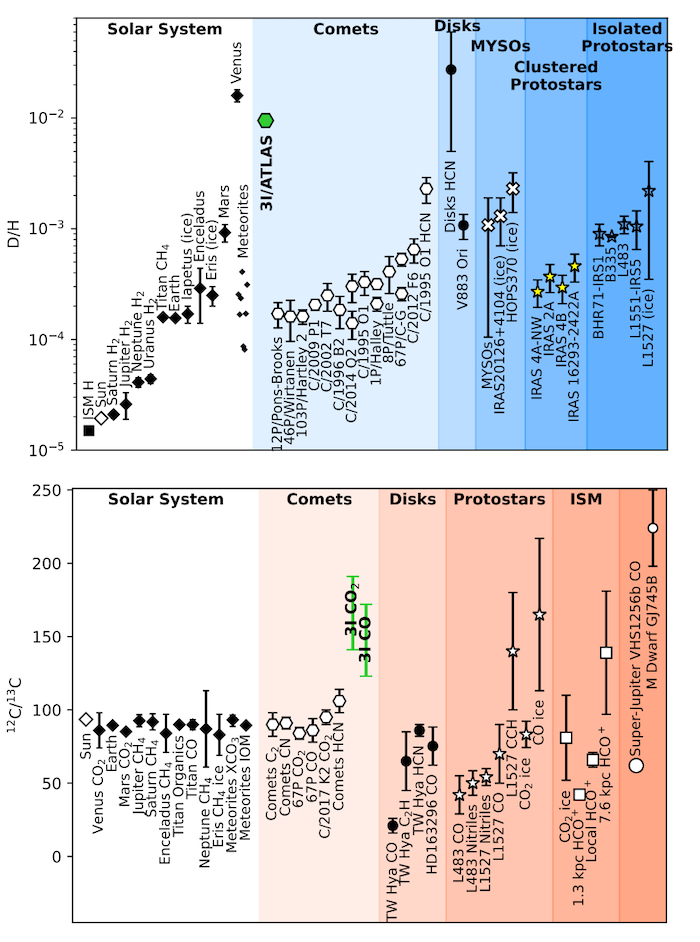 Isotopic ratios observed in the coma of 3I/ATLAS compared with Galactic and Solar System observations for D/H (top) and 12C/13C (bottom). Data are from the compilation of Nomura et al. (2023), with additional D/H values for V883 Ori (gas-phase; Tobin et al. 2023), and IRAS20126+4104, HOPS370 and L1527 (ice-phase; Slavicinska et al. 2024, 2025). D/H data are for H2O unless otherwise specified. The “disks HCN” data represent the mean and range of observed D/H values across five protoplanetary disks. For 12C/13C, the meteoritic “XCO3” and “IOM” data are the mean values (and ranges) for carbonates and insoluble organic matter, respectively, in carbonaceous chondrites (Alexander et al. 2007, 2010, 2015); the TW Hya and HD 163296 values for CO are from Yoshida et al. (2022); Qi et al. (2026); protostellar ice CO and CO2 are the mean values from Brunken et al. (2024); interstellar CO2 ice is the average (and range) of values from Boogert et al. (2015); interstellar HCO+ values for three Galactocentric distances are from Luo et al. (2024); super-Jupiter exoplanet CO data are from Gandhi et al. (2023); M dwarf GJ745 data are from Crossfield et al. (2019). Error bars are 1σ unless otherwise specified. — astro-ph.EP