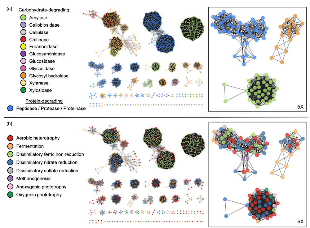 Diverse metabolisms share functionally and genetically similar exoenzymes. Sequence similarity network of predicted exoenzymes associated with (A) enzyme type based on sequence annotation; and (B) metabolic guild. The 1307 exoenzyme protein sequences are depicted by individual nodes (colored circles). Edges (grey lines) between the nodes indicate a pairwise BLAST e-value of 1×10-30 345 . Each exoenzyme sequence is represented by a node (colored circle); 1,267 nodes are grouped into 48 clusters (e-value of 1×10-30 346 ) based on high sequence similarity, though 40 sequences were dissimilar from all other sequences and are thus not connected to any other nodes. Featured clusters (right panels) depict how diverse metabolic guilds share functionally and genetically similar exoenzymes. — biorxiv.org