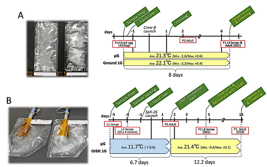 Overview of the C. elegans Neuronal Integrated System (NIS) experiment and cultivation status. (A) Small culture bags were used to observe F1 generation nematode motility, grown from eggs in space μG until adulthood, and to analyze gene expression after freezing. Ground 1G samples at Kennedy Space Center received identical treatment. (B) The larger bag contained 10-day-old adult worms grown in space with FudR added at D01 to inhibit the development of the next generation. Half of the samples were chemically fixed in orbit for histological analysis, while the other half were frozen for gene expression analysis to study the effects of μG aging. Orbit 1G samples underwent artificial 1G centrifugation on the ISS. The culture bags contained white plastic beads for contact stimulation. — biorxiv.org