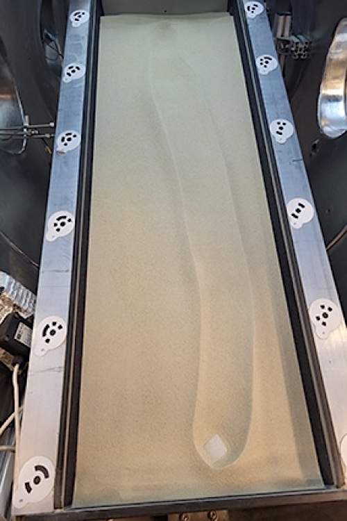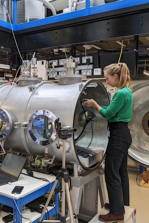Together with master student Simone Visschers, she travelled to the English city of Milton Keynes to solve the mystery behind these unusual sand gullies. The Open University has a ‘Mars chamber’: a facility for simulating Martian conditions. Financial support from the British Society of Geomorphology made the visit possible. “We tried out various things by simulating a dune slope at different angles of steepness. We let a block of CO2 ice fall from the top of the slope and observed what happened”, states the researcher. “After finding the right slope, we finally saw results. The CO2 ice block began to dig into the slope and move downwards just like a burrowing mole or the sandworms from Dune. It looked very strange!”