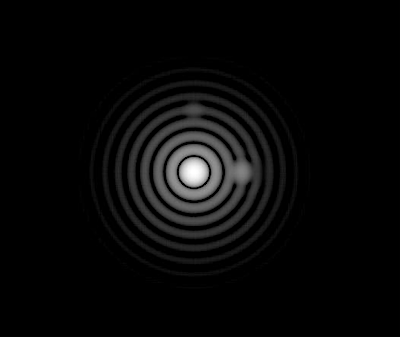 A logarithmically scaled simulation of the image of a star with two nearby exoplanets, as seen by a telescope with a circular aperture. The centered multi-ringed Airy pattern is due to diffraction of the starlight. Off-axis exoplanets fainter by 100 times and 1000 times are seen at 3 o’clock on the 3rd Airy ring, and at 12 o’clock on the 4th Airy ring, respectively. An Earth-like exoplanet would be 10 million times fainter than the dimmer of the two exoplanets shown. Gene Serabyn, NASA JPL