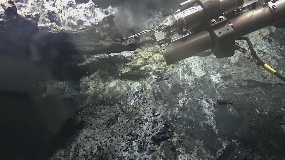 It shimmers and sparkles in the deep sea: Under the protruding flange of the hydrothermal vent on the Knipovich Ridge, hot fluids reflect the light due to their optical properties. The image was taken during Expedition MSM131 with the remotely operated vehicle (ROV) MARUM-QUEST 4000. Photo: MARUM – Center for Marine Environmental Sciences, University of Bremen.