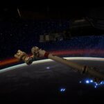 Preflight microscopic image of C. elegans worms expressing fluorescent labels, reporting on changes in gut, nerve, and muscle function as part of C. elegans Biological Investigation on Microbiome Effect in