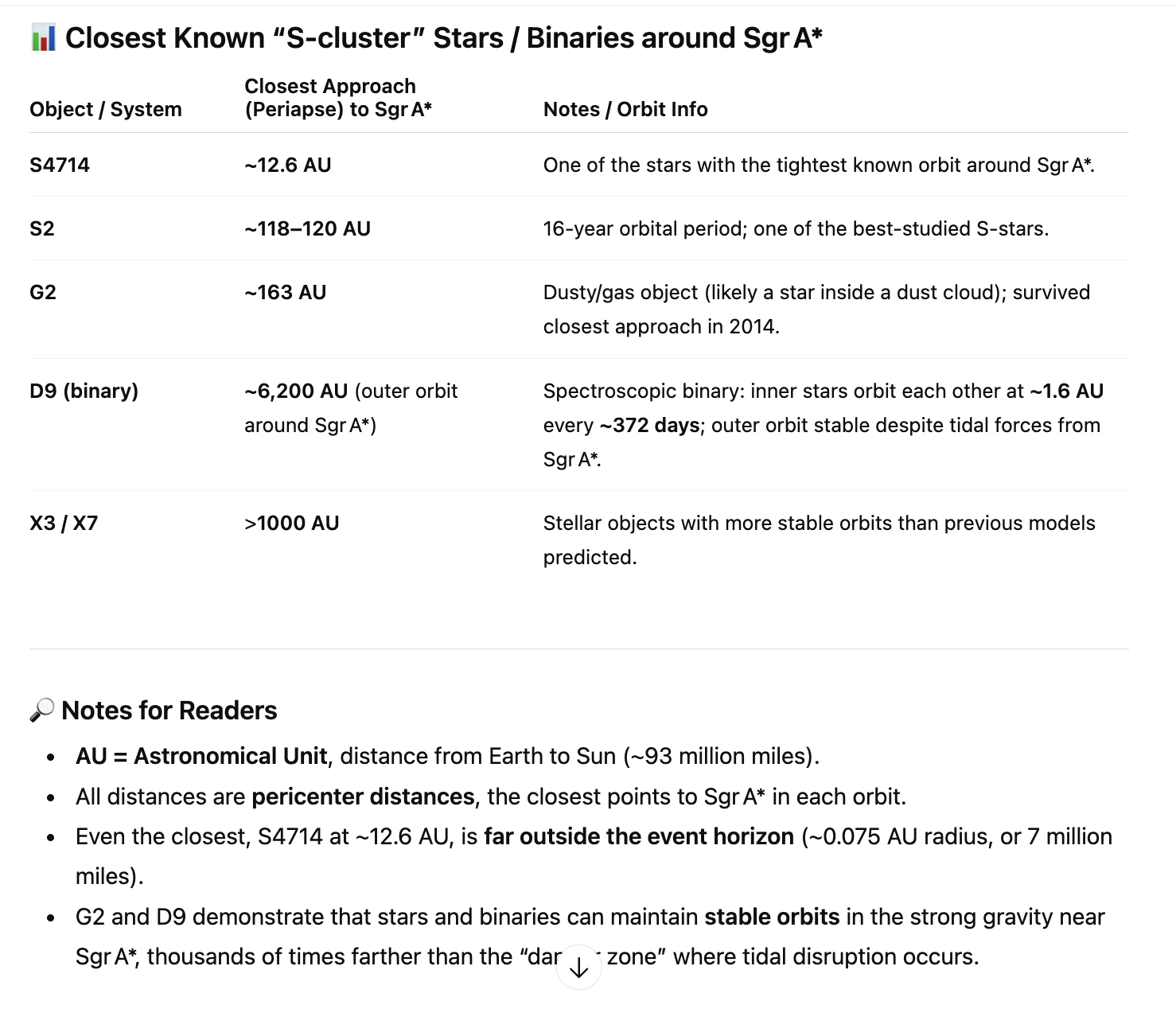 The following is a table of some of the closest known “S-cluster,” stars / binaries with their periapse distances (a periapsis, or pericenter, is the point in an orbit where a celestial body is closest to the central body it is orbiting).