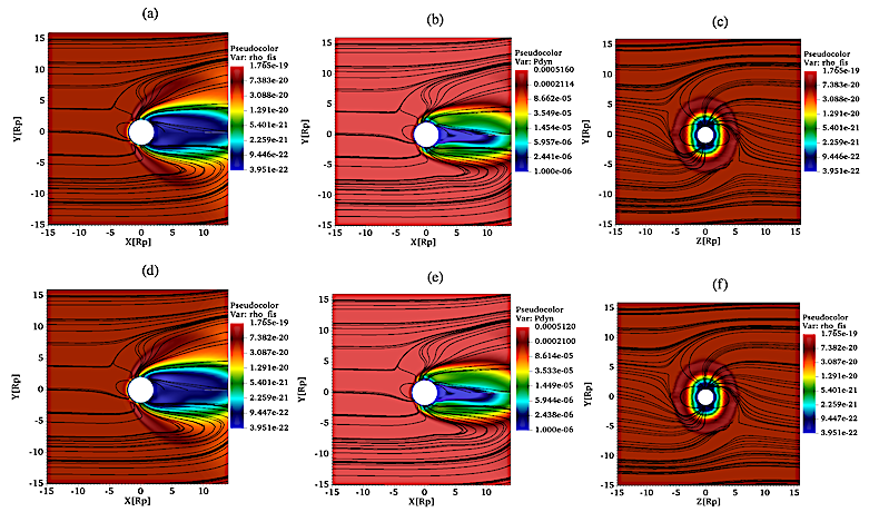 Case #2. Equatorial-plane maps of mass density 𝜌 (panels a and d; g cm−3 ) and dynamic pressure 𝑝dyn (panels b and e; dyn cm−2 ), with magnetic field lines overplotted in black. Panels c and f show meridional-plane maps of 𝜌 at 𝑥 = 1.5 𝑅p. The top row corresponds to 𝜂 = 0 cm2s −1, and the bottom row to 𝜂 = 5.38018 × 1012cm2 s−1 .