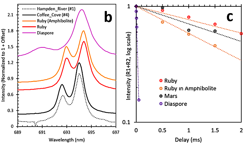 Image of Coffee_Cove (Sol 1466) with the locations and fields of view for the luminescence analyses (b). Comparison of luminescence lifetimes for Cr3+ peaks identified in Smiths_Harbour (Mars) spectra compared to lab data (c). — LPSC