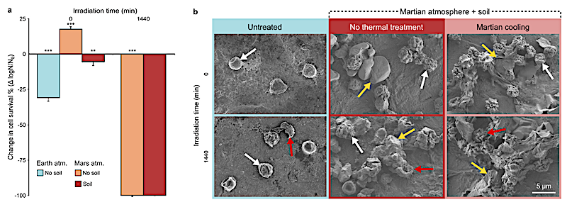 Influence of simulated Martian temperature on the survival and morphology of A. calidoustus conidia. (a) Change in mean survival induced by 1,440 min of Martian cooling in pure dried microbial cell samples (light red) or dried cells mixed with Martian regolith (dark red). Simultaneous to Martian cooling, samples were exposed to up to 1,440 min of simulated Martian solar irradiation and Martian atmosphere. This was compared against unirradiated pure-cell samples, under an Earth atmosphere (light blue). n = 3 and error bars represent standard deviation. Asterisks indicate treatments that statistically differ from their non-thermally treated equivalent, as determined by a one-way ANOVA (*, P < 0.05; **, P < 0.01; ***, P < 0.001). (b) SEM images demonstrating the morphological changes of A. calidoustus conidia during exposure to SMC (irradiation, atmosphere, regolith, and cooling). White arrows indicate intact conidia, red arrows indicate lysed conidia, and yellow arrows indicate soil particles. Scale bar equals 5 µm. — Environmental Microbiology