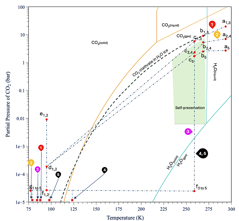Pressure–temperature (P–T) conditions of our experiments compared to phase diagram of the CO2–H2O system. Red dots correspond to actual P–T conditions at various stages of ice preparation. Dashed lines are only indicative and do not correspond to measured variations in pressure. Paths labeled in red, yellow, and magenta correspond to ice retaining CO2. Paths labeled in black correspond to ice devoid of CO2. Lowercase letters show the stages of the experiment described in the text, with subscripts showing the applicable experiment number. The stars near the bottom left denote the P–T conditions during acquisition of spectra. — The Planetary Science Journal
