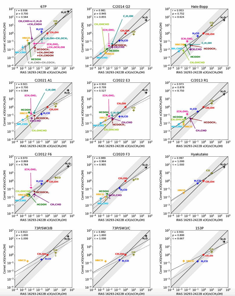 Comparison of COH-molecule abundances relative to CH3OH in comets and IRAS 16293-2422B. Included in the plots are the Pearson correlation (r), Spearmans rank correlation (ρ) and Kendall correlation (τ ) coefficients for the log-log comparison. The solid line shows the 1:1 agreement, with the shaded area indicating a variation of a factor of 10 on either side of this. The dashed line is the regression line calculated using the least-squares method (with the upper limits replaced by 50% of their reported value), and the dotted line is the regression line calculated using the ATS method. — astro-ph.EP