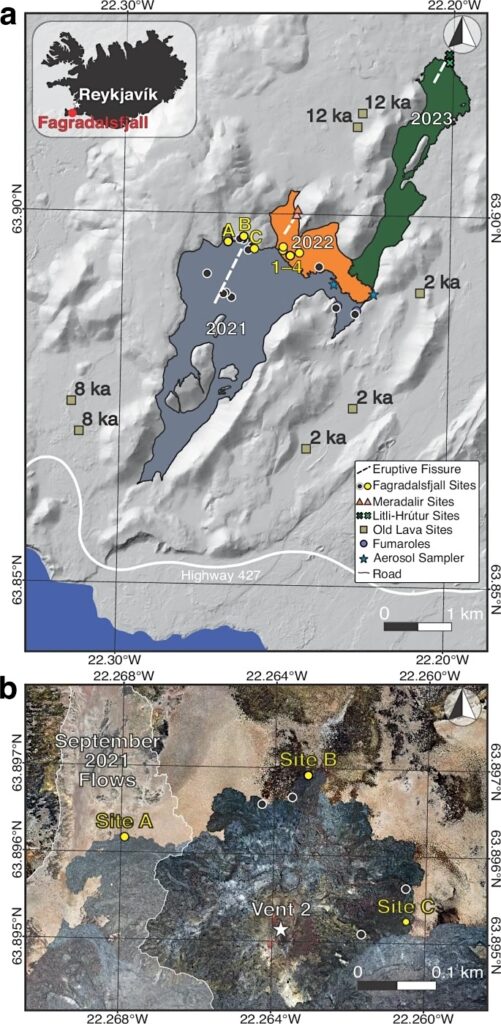 a Fagradalsfjall (blue-gray), 2022 Meradalir (orange), and 2023 Litli-Hrútur (green) eruptions with a background hillshade derived from previous work25,69,70. A total of 18 Fagradalsfjall, 3 Meradalir, 4 Litli-Hrútur sampling sites were established, though some are too closely spaced to be individually resolved on the map. Note that sampling sites 1, 2, 3, and 4 were from Fagradalsfjall, but were later resurfaced by new lava flows from Meradalir. Earlier in the eruption, day 1 sites were established near the eruptive vent but quickly covered. Additional sites were collected in 2024 to determine spatial variability, indicated by the black circles for Fagradalsfjall, pink triangles for Meradalir, and light green × for Litli-Hrútur. b Inset of area around Sites A–C. A late-stage breakout in September of 2021 covered Site A and the area of the flow is shown in transparent white. — Communications Biology